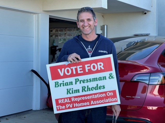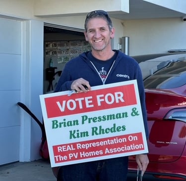 Kim would like PVHA to better serve homeowners in PVE. Working with PVHA should be collaborative and support homeowners and home values. Kim is running for the PVHA Board because elected representatives are fundamental to organizational governance. In the last several decades, there has been an elected board only once because a quorum has not been reached. Self-appointed leaders, antiquated practices, lack of transparency, inadequate guidelines, inconsistent rules enforcement, unnecessary delays, preferential treatment for connected architects and designers has been tolerated for too long. The PVHA should be a partner and advocate for shared community goals - transformation is long overdue!